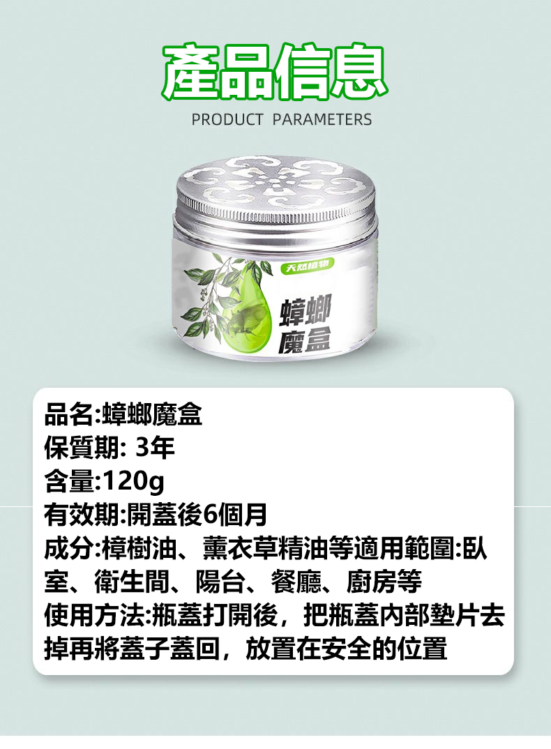 5分鐘前【日本驅蟲魔盒】蟑螂的生命力太頑強了!家裡只要有一隻那可就糟了,要不了幾天就會氾濫了!趕緊在家裡放這個【蟑螂魔盒】植物萃取不刺激,還能淨化空氣。母嬰可用,給家裡安裝一道屏障,讓蟑螂無處藏身 - 6入組NT$998
