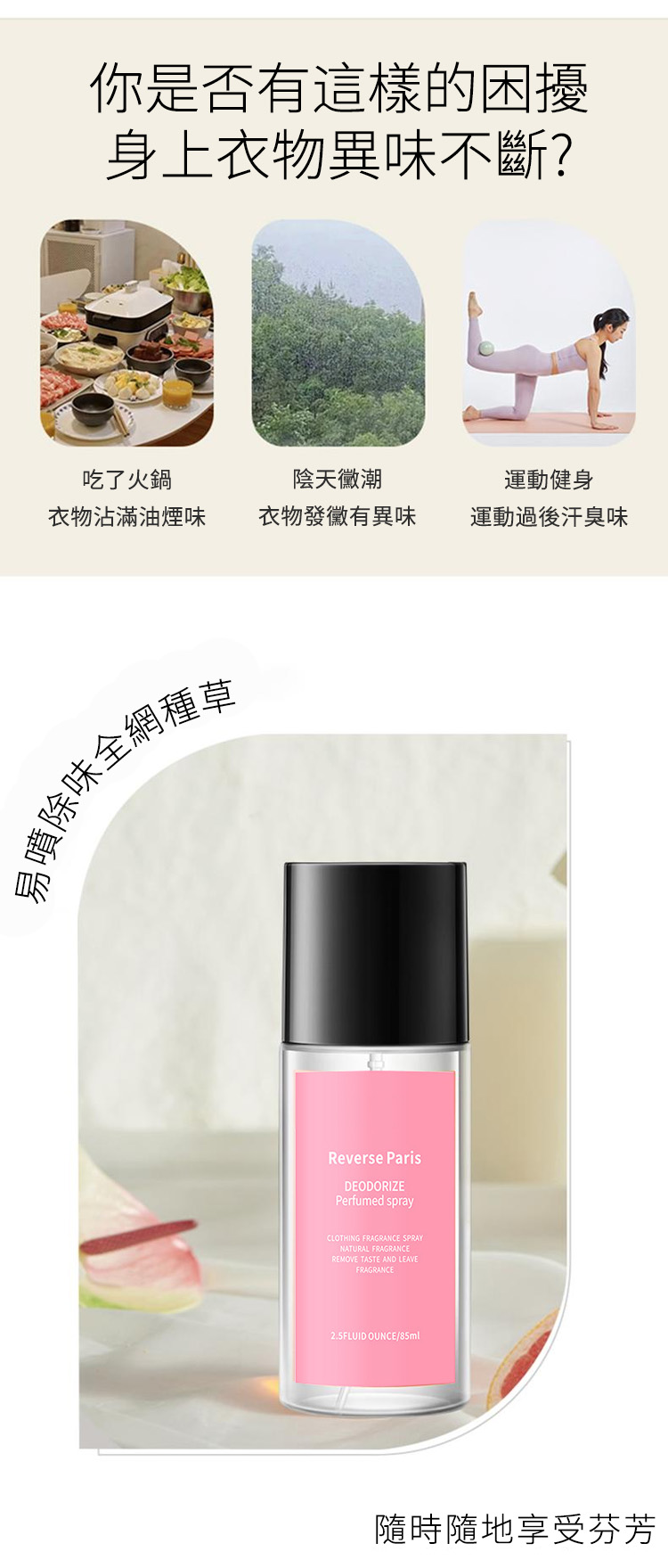 半小時前【衣物香氛喷雾】不用洗衣服,也能去除衣服異味。一噴就香,留香持久,讓衣服擁有自然體香。 - 【買3送3 】6入組 NT$1298